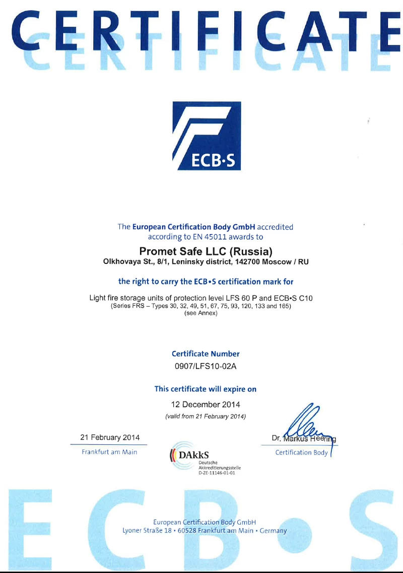 По итогам лабораторных испытаний сейфу присвоен высокий класс 60Б по огнестойкости, что подтверждается как европейским, так и отечественным сертификатами качества.